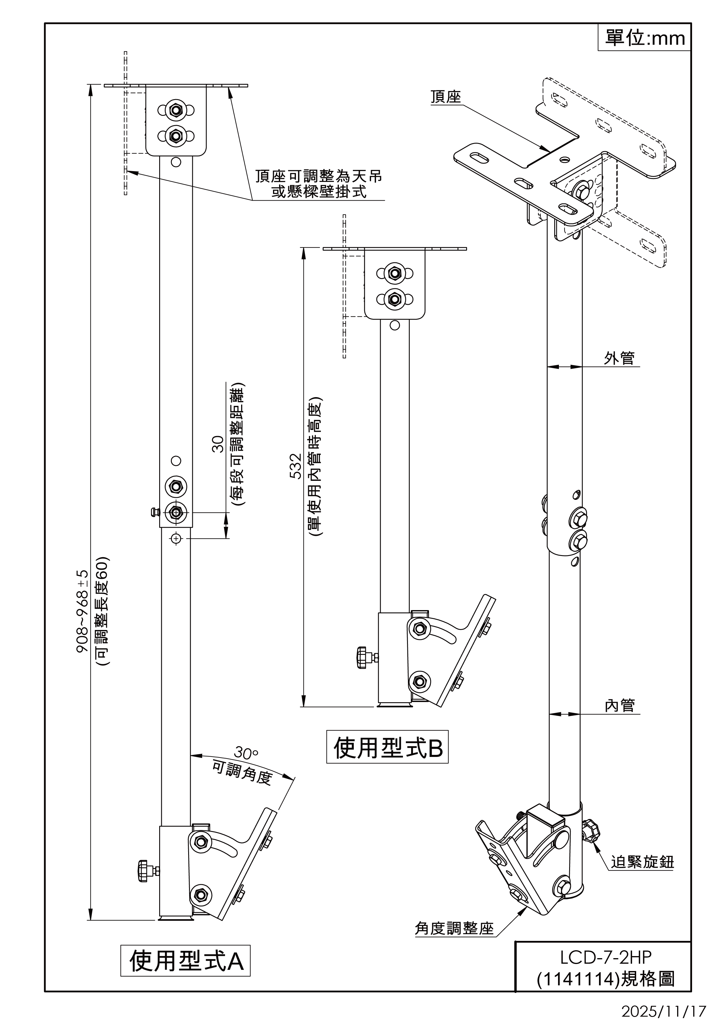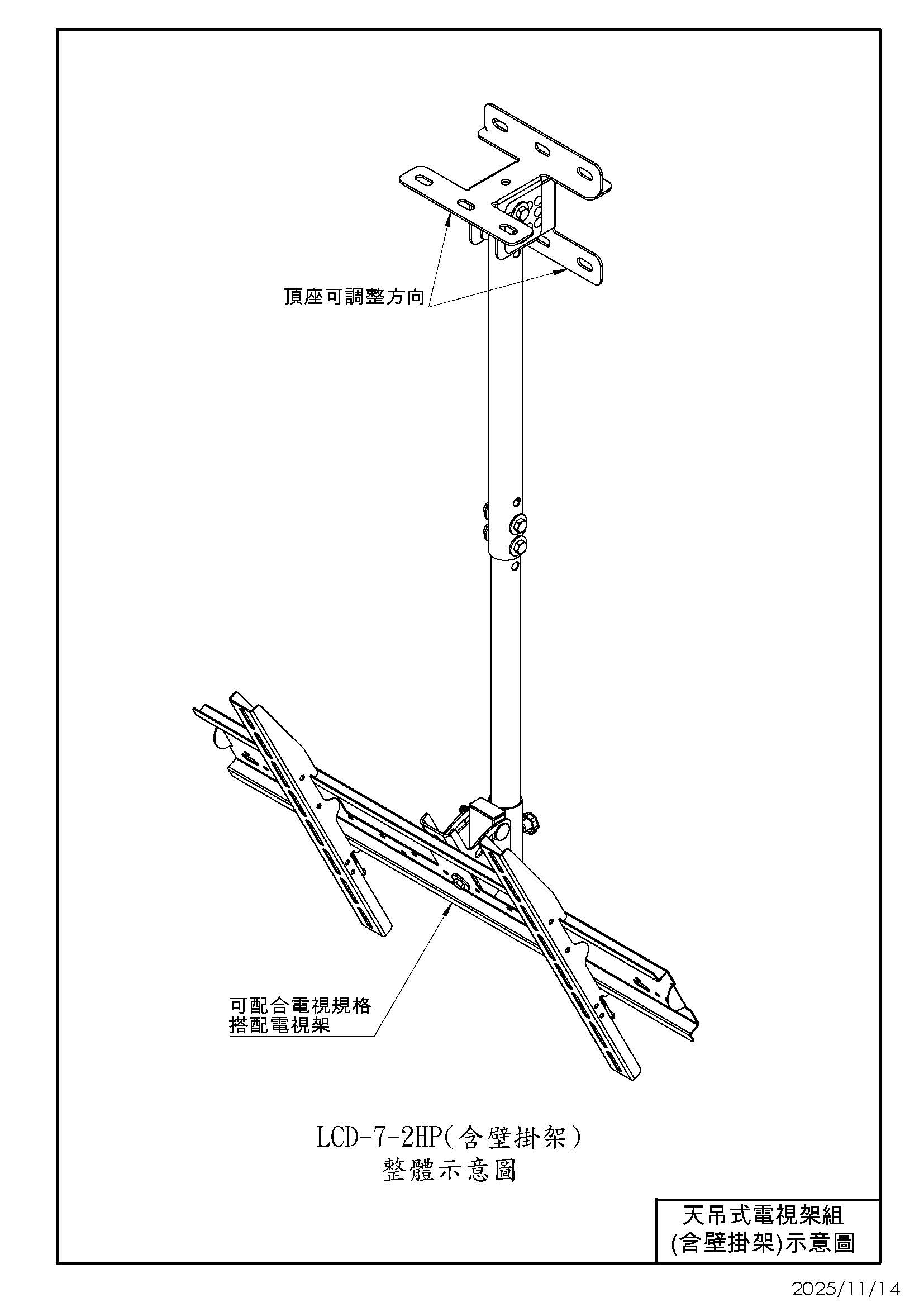 懸吊及壁掛設計:安裝方式可自由切換。 360° 旋轉:暢享多角度視覺體驗。 俯角可調:適用多種使用場所。 多段高度調整:符合不同需求。 承重穩固:最大承重量可達 50 公斤。 大型電視通用:適合各種尺寸螢幕。