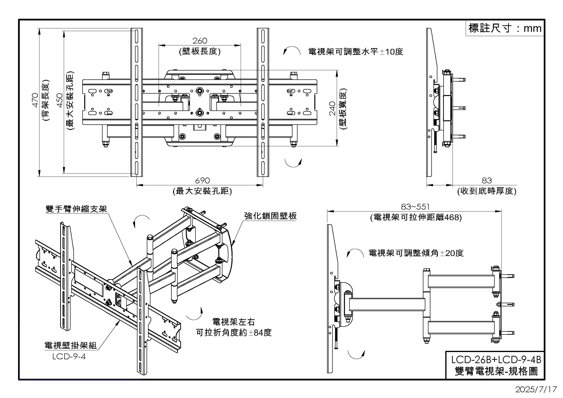 支援最大 690 × 450 mm,適配多種電視孔位。
